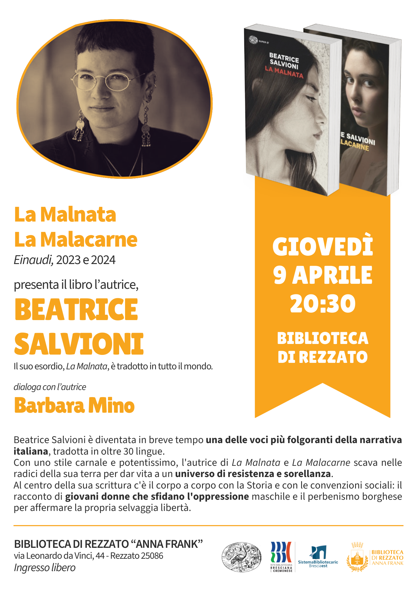 La Biblioteca di Rezzato "Anna Frank" ospita Beatrice Salvioni, una delle voci più folgoranti della narrativa italiana contemporanea. L'autrice presenterà i suoi successi editoriali editi da Einaudi, opere che hanno riscosso un eccezionale consenso internazionale.
